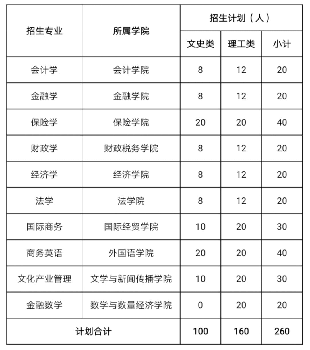 学校2019年综合评价招生专业为会计学、金融学、保险学、财政学、经济学、法学、国际商务、商务英语、文化产业管理、金融数学,招生计划为260人,其中:文史类计划100人,理工类计划160人。分专业招生计划如下: